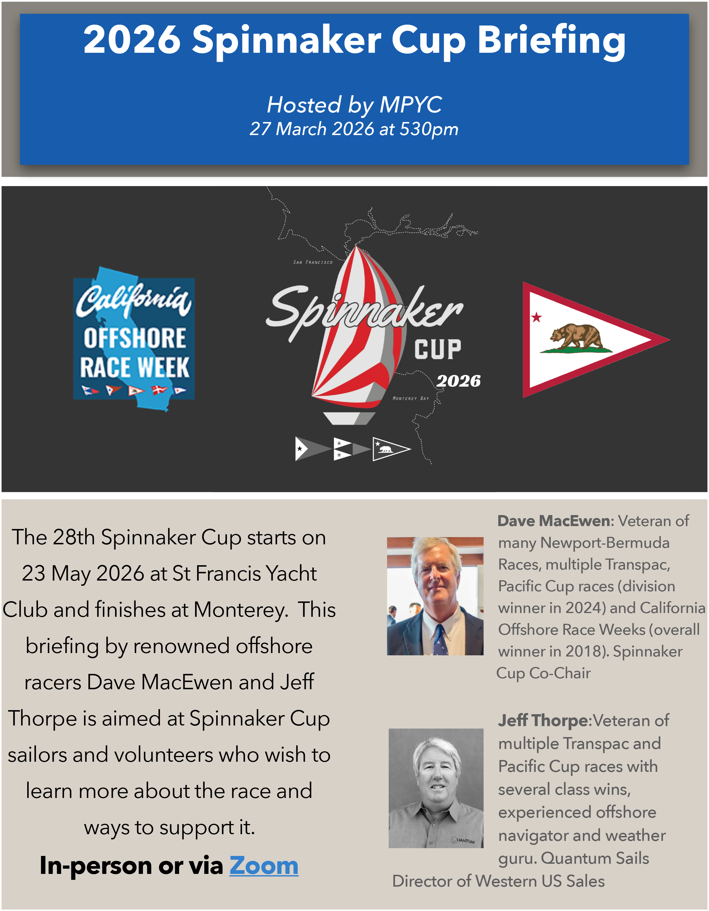 Join the presentation live at MPYC or via Zoom on Friday, March 27, 5:30 PM. Learn about the plans for the 2026 Spinnaker Cup and some changes planned to improve the event. Presented by Dave MacEwen and Jeff Thorpe.
